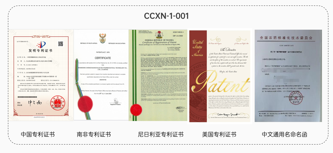 化合物及用途專利已獲得中國專利授權(quán)、南非專利授權(quán)、尼日利亞專利授權(quán),美國專利授權(quán),印度專利,柬埔寨專利和泰國專利已提交申請。已獲得農(nóng)藥標(biāo)準(zhǔn)化委員會核準(zhǔn)的中文通用名“萘異噁唑酰胺”,ISO英文通用名申請已提交。目前該品種已與國內(nèi)知名農(nóng)藥企業(yè)達(dá)成共同海外登記注冊的戰(zhàn)略合作意向。
